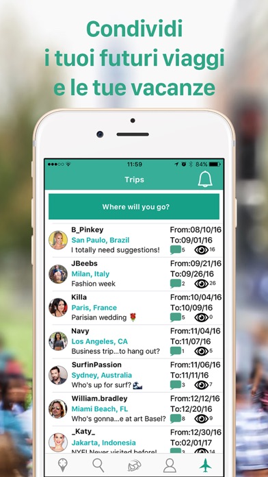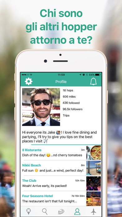 - VIAGGI: Stai pianificando un viaggio e vuoi far sapere a tutti che presto sarai in una nuova città? Pubblica un nuovo viaggio per informare gli hopper locali, così potrai conoscere nuove fantastiche persone!